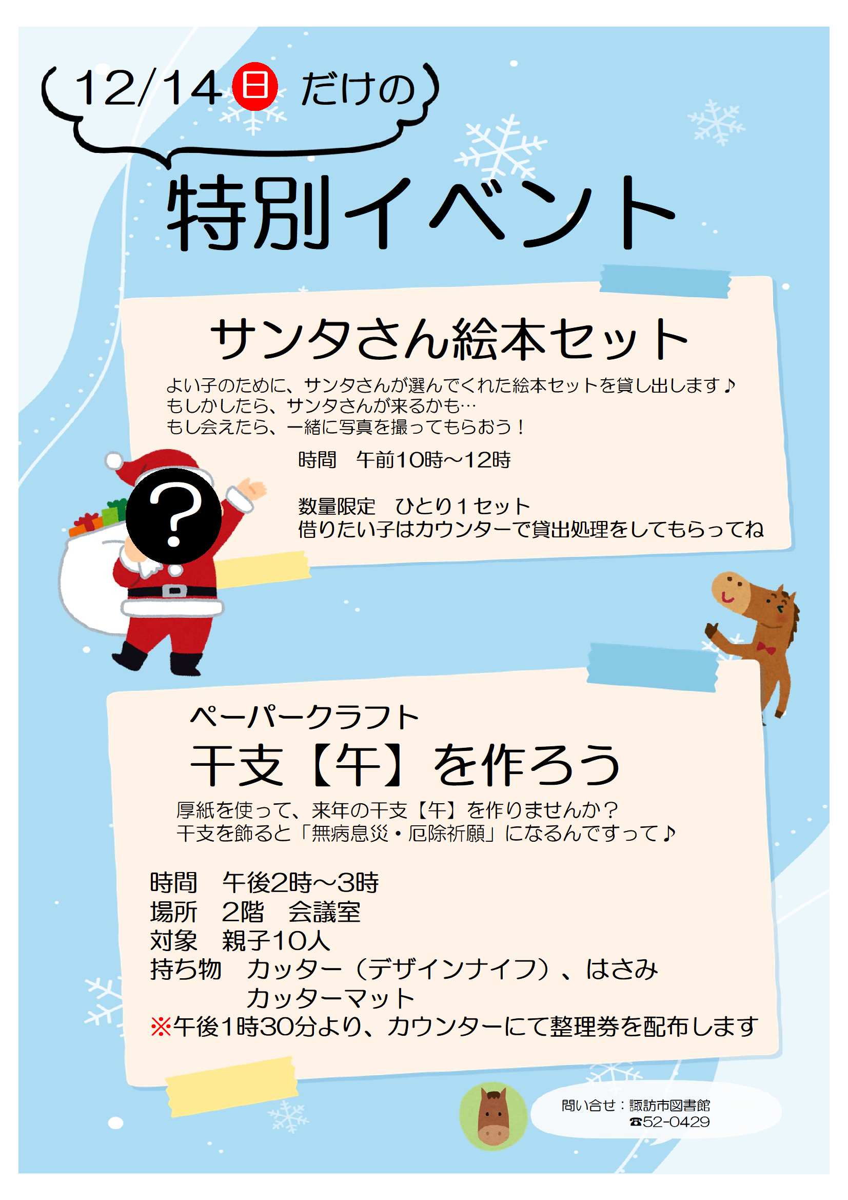 その1 「サンタさん絵本セット」 サンタさんが選んだ絵本セットを貸出します。 時間:午前10時~12時 場所:1階 クリスマスコーナー