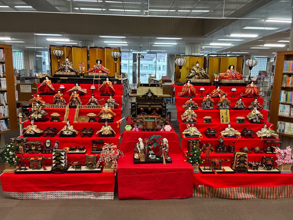 諏訪市図書館では3月26日(木)まで7段飾りのおひなさまを展示しています。
